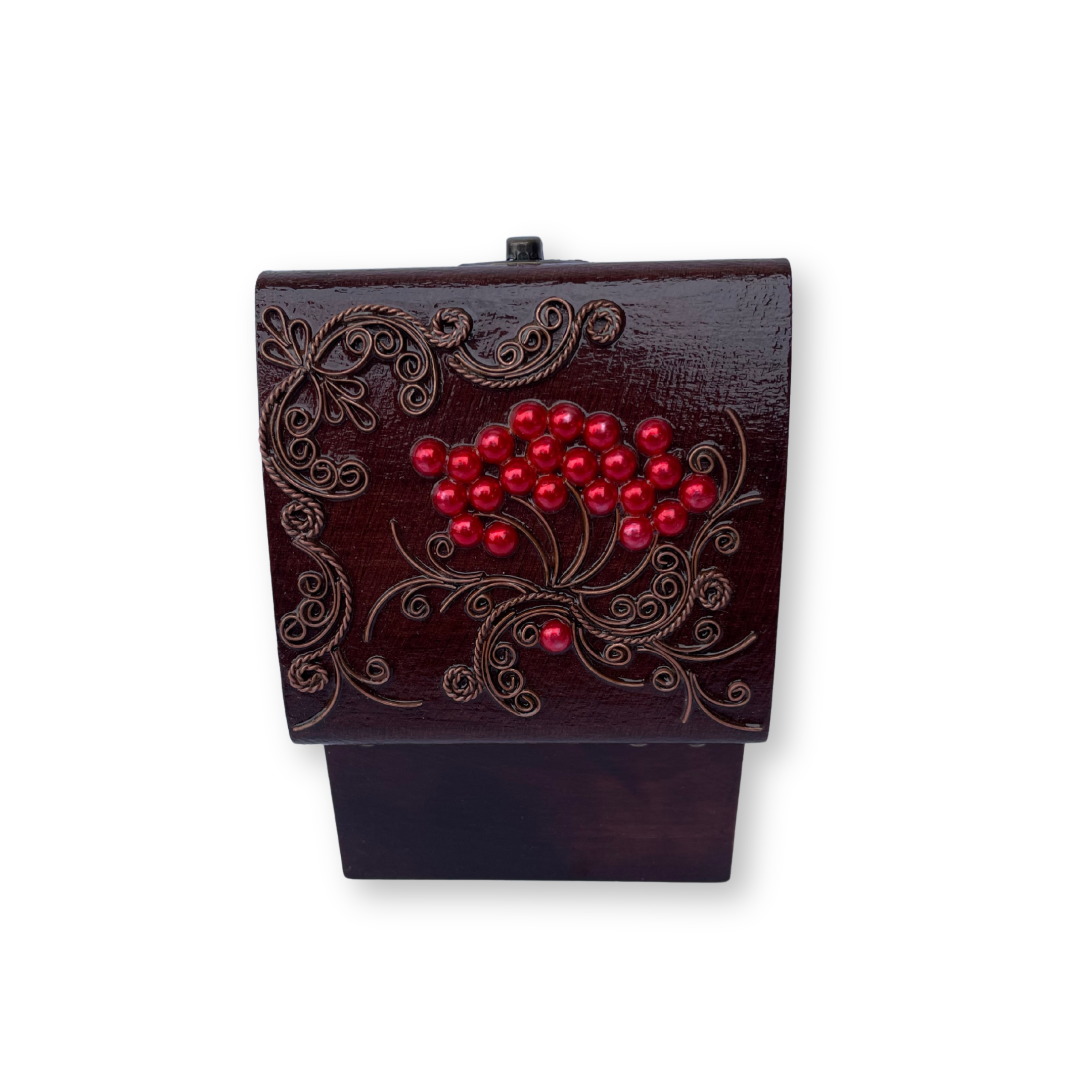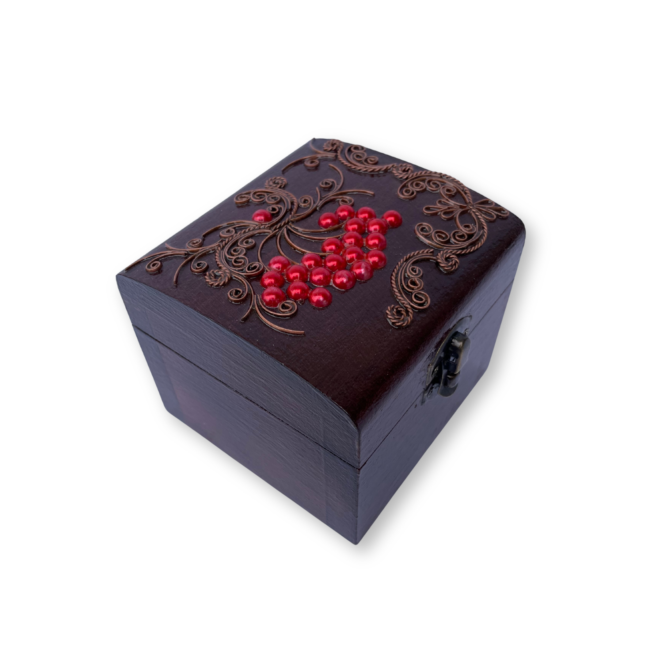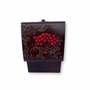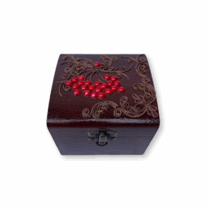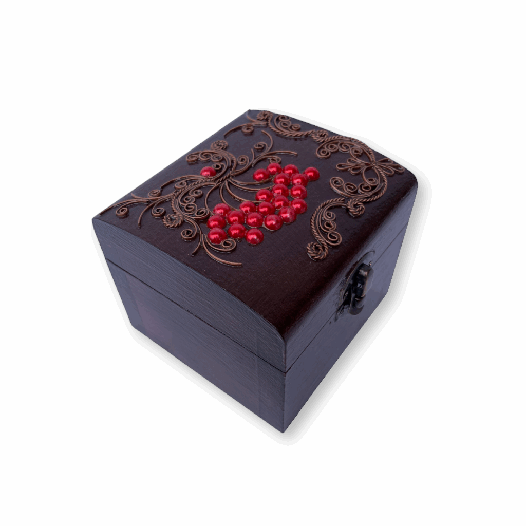 - Ексклюзивна техніка: Кожна шкатулка прикрашена унікальним орнаментом з тонкого мідного дроту в техніці, що імітує старовинну ювелірну філігрань. Це надає виробу об’єму та витонченості.