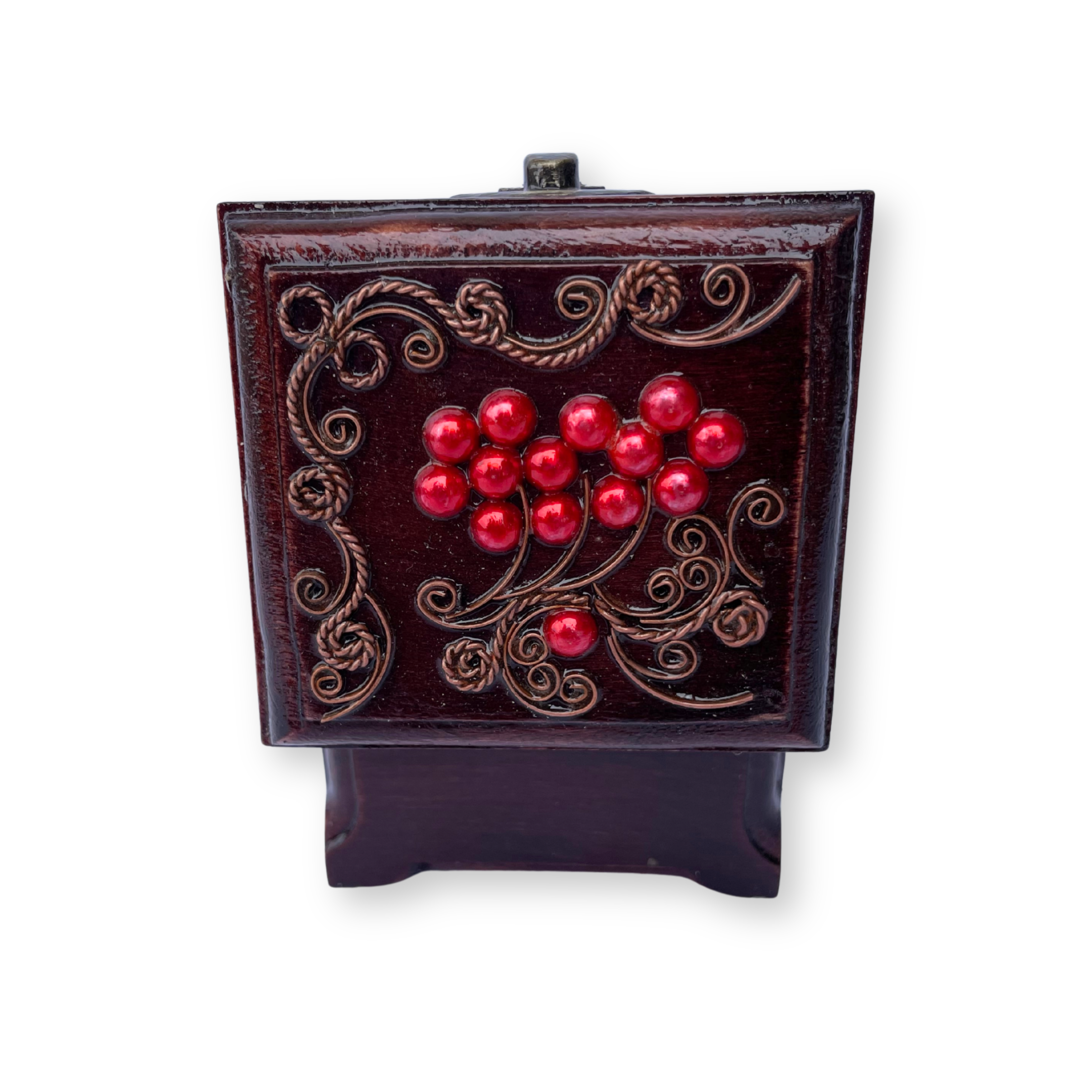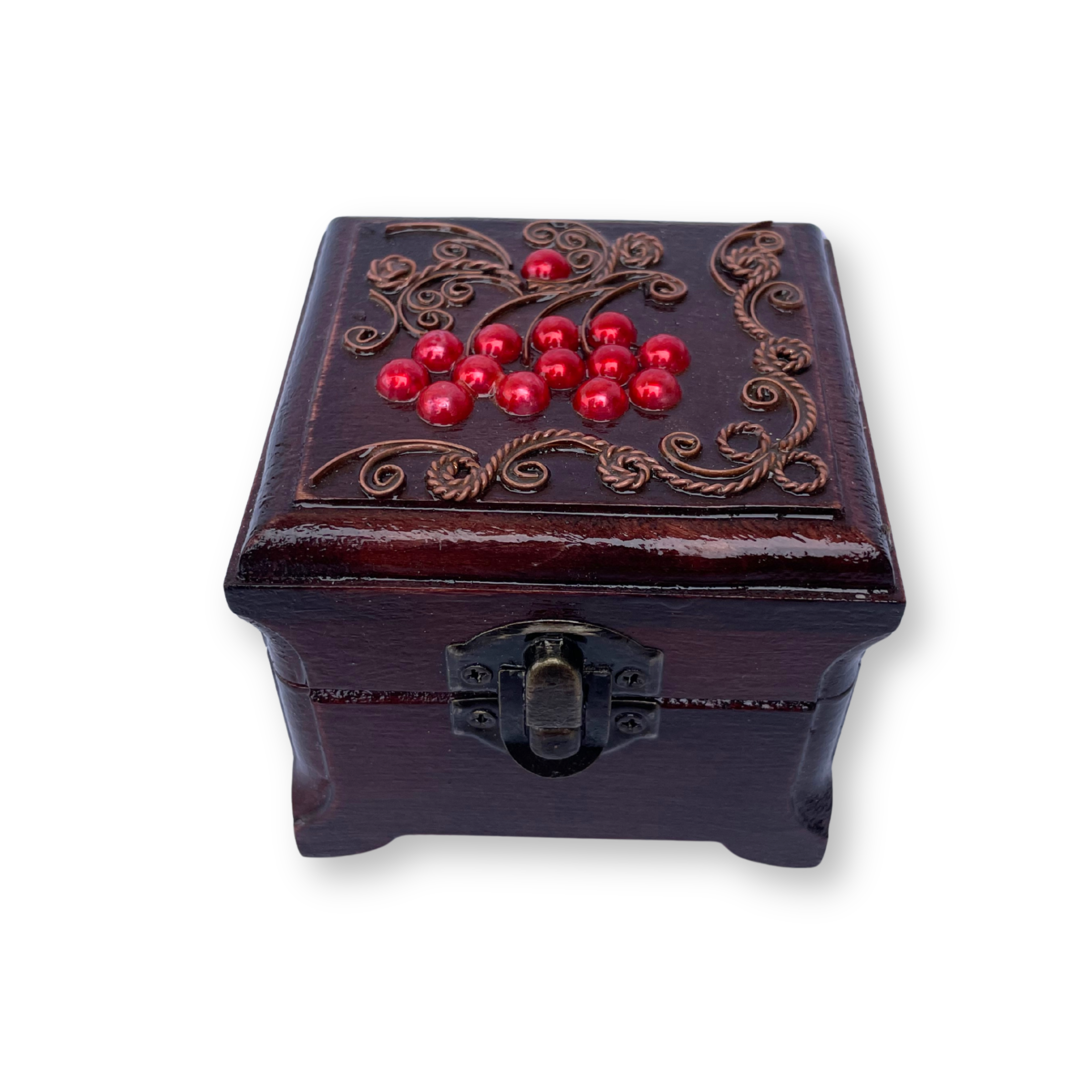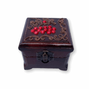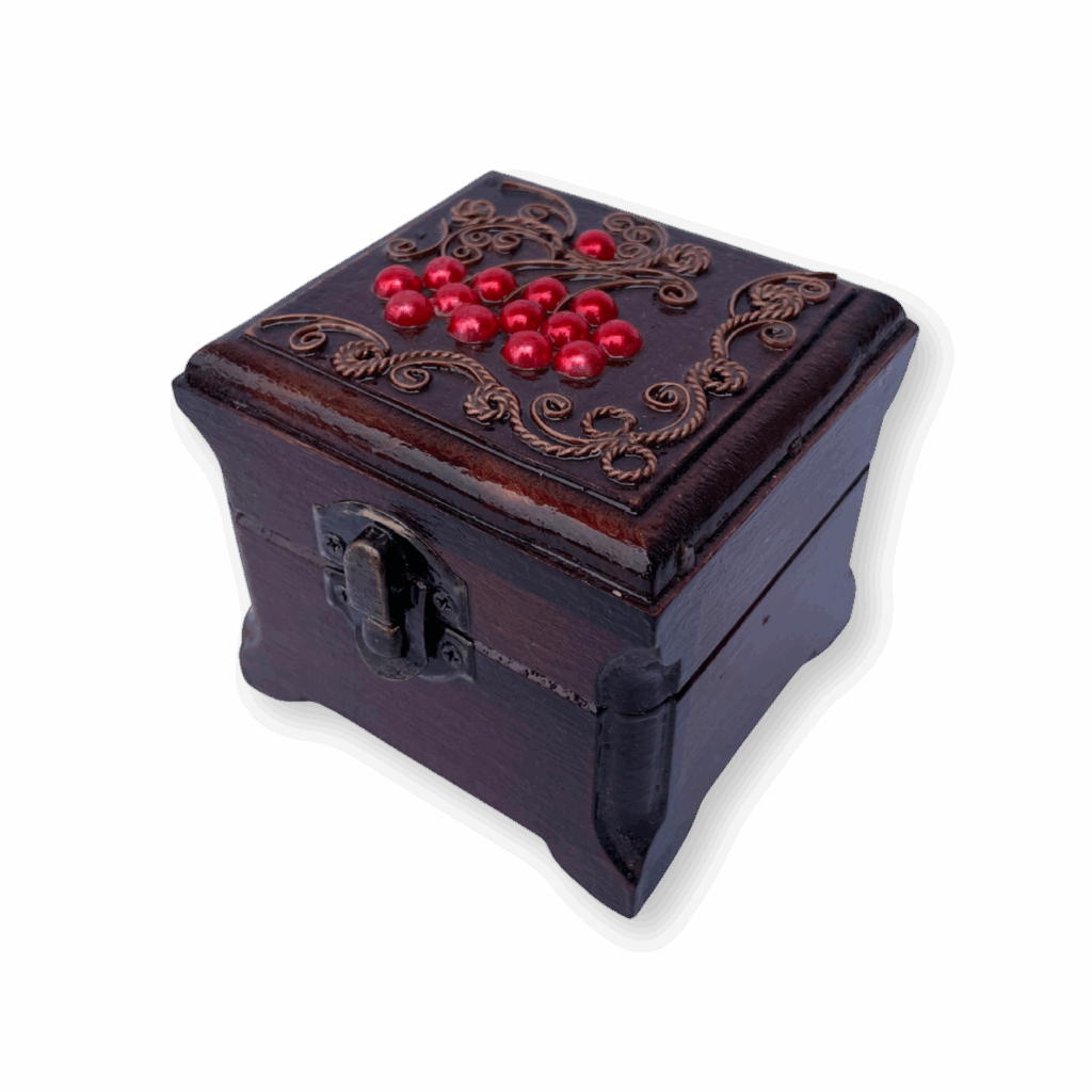 - Ексклюзивна техніка: Кожна шкатулка прикрашена унікальним орнаментом з тонкого мідного дроту в техніці, що імітує старовинну ювелірну філігрань. Це надає виробу об’єму та витонченості.