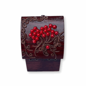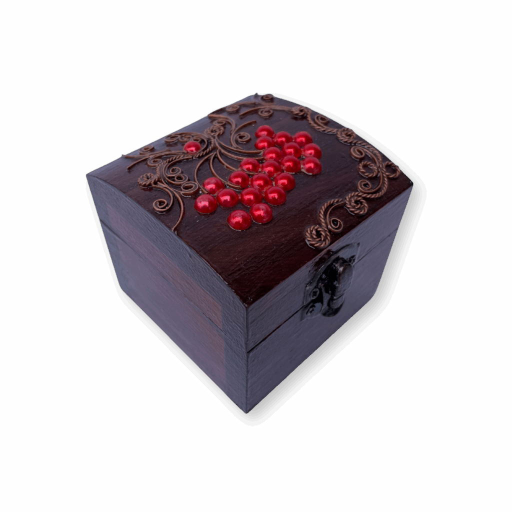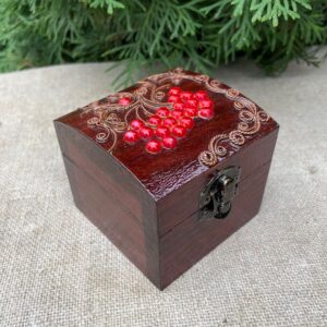 - Ексклюзивна техніка: Кожна шкатулка прикрашена унікальним орнаментом з тонкого мідного дроту в техніці, що імітує старовинну ювелірну філігрань. Це надає виробу об’єму та витонченості.