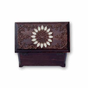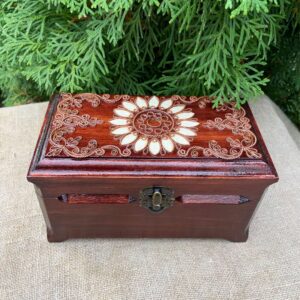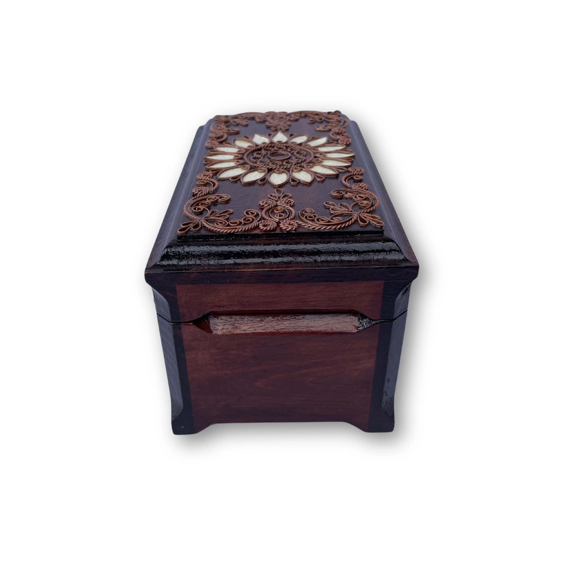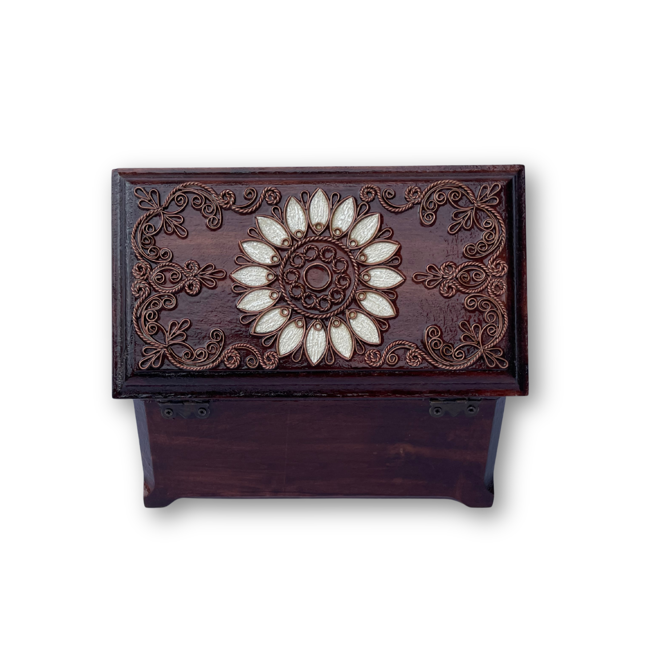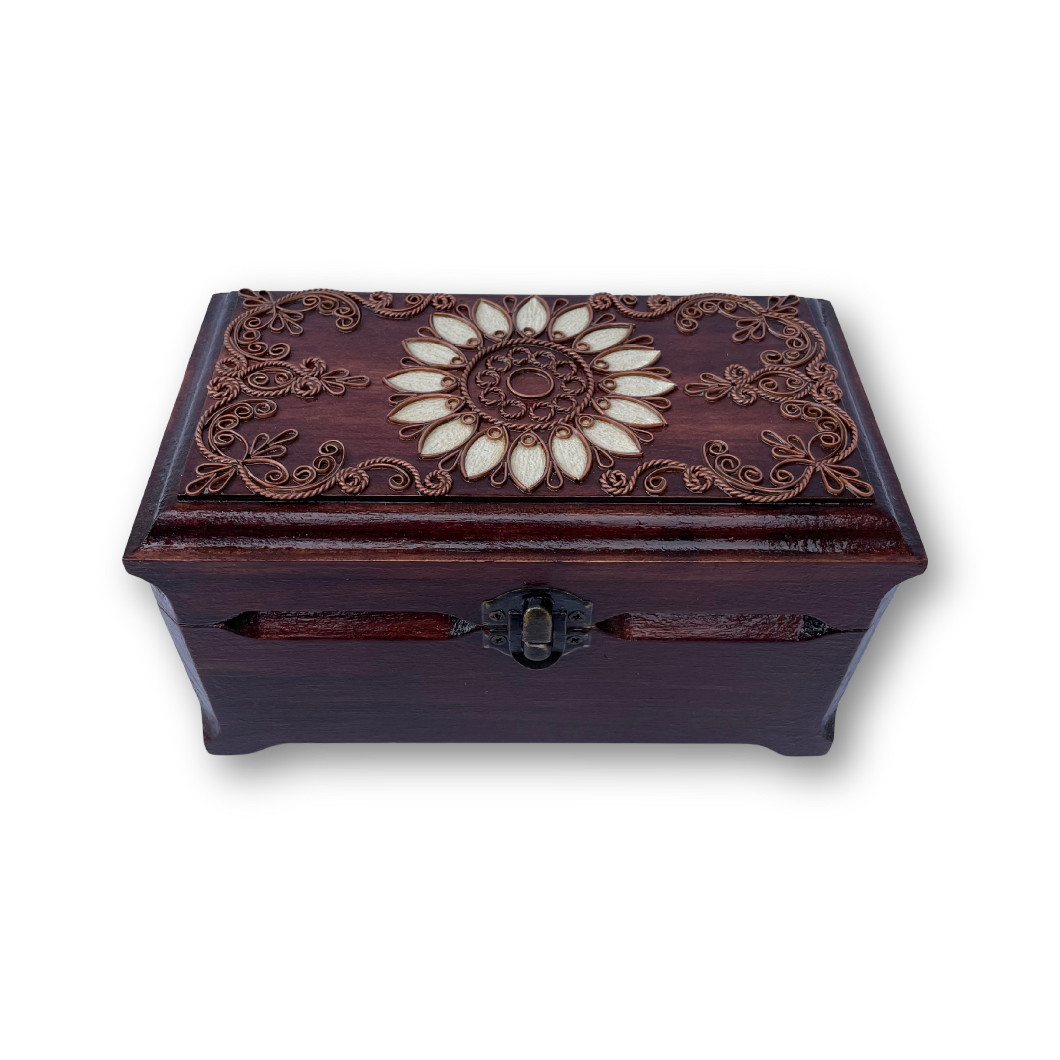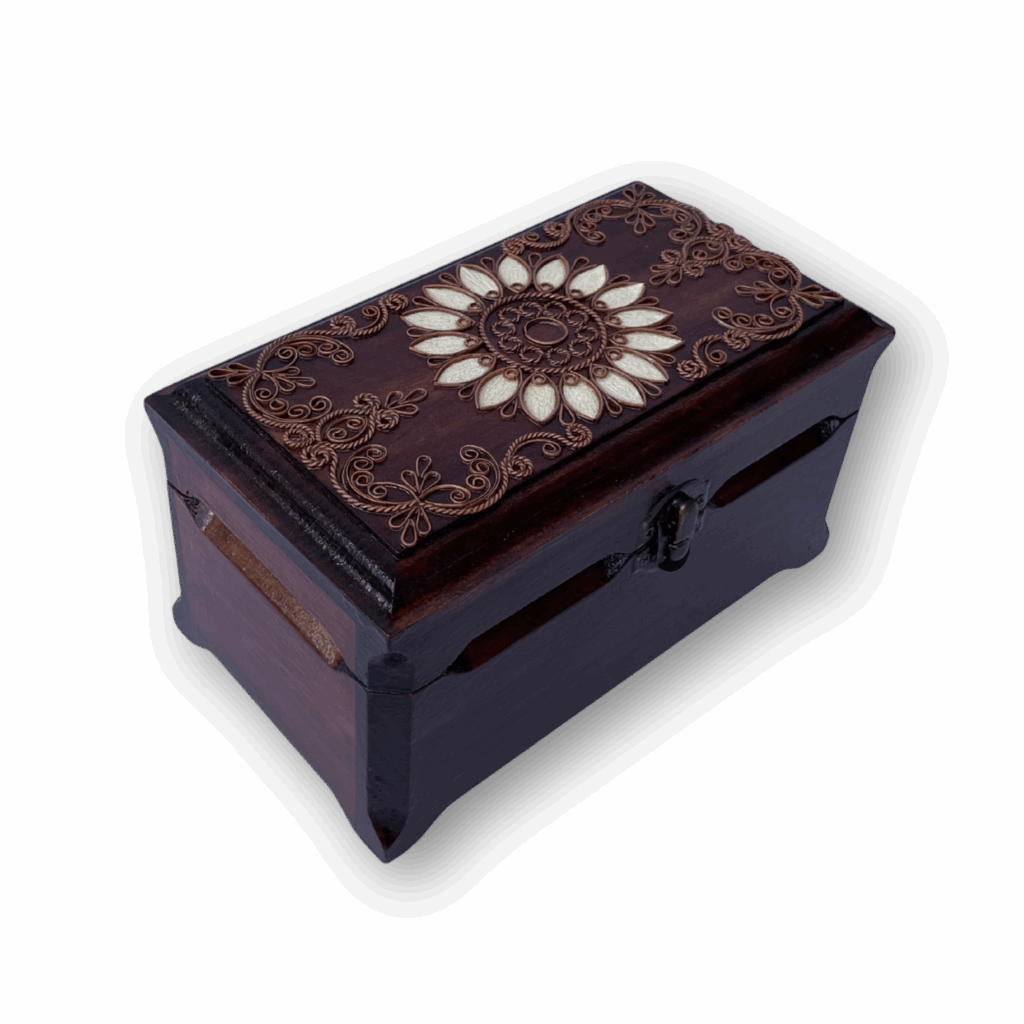 - Ексклюзивна техніка: Кожна шкатулка прикрашена унікальним орнаментом з тонкого мідного дроту в техніці, що імітує старовинну ювелірну філігрань. Це надає виробу об’єму та витонченості.
