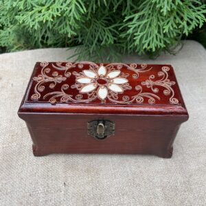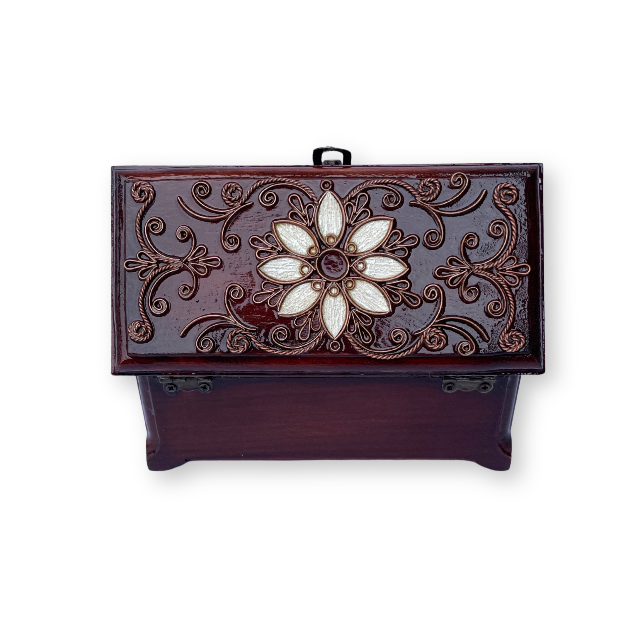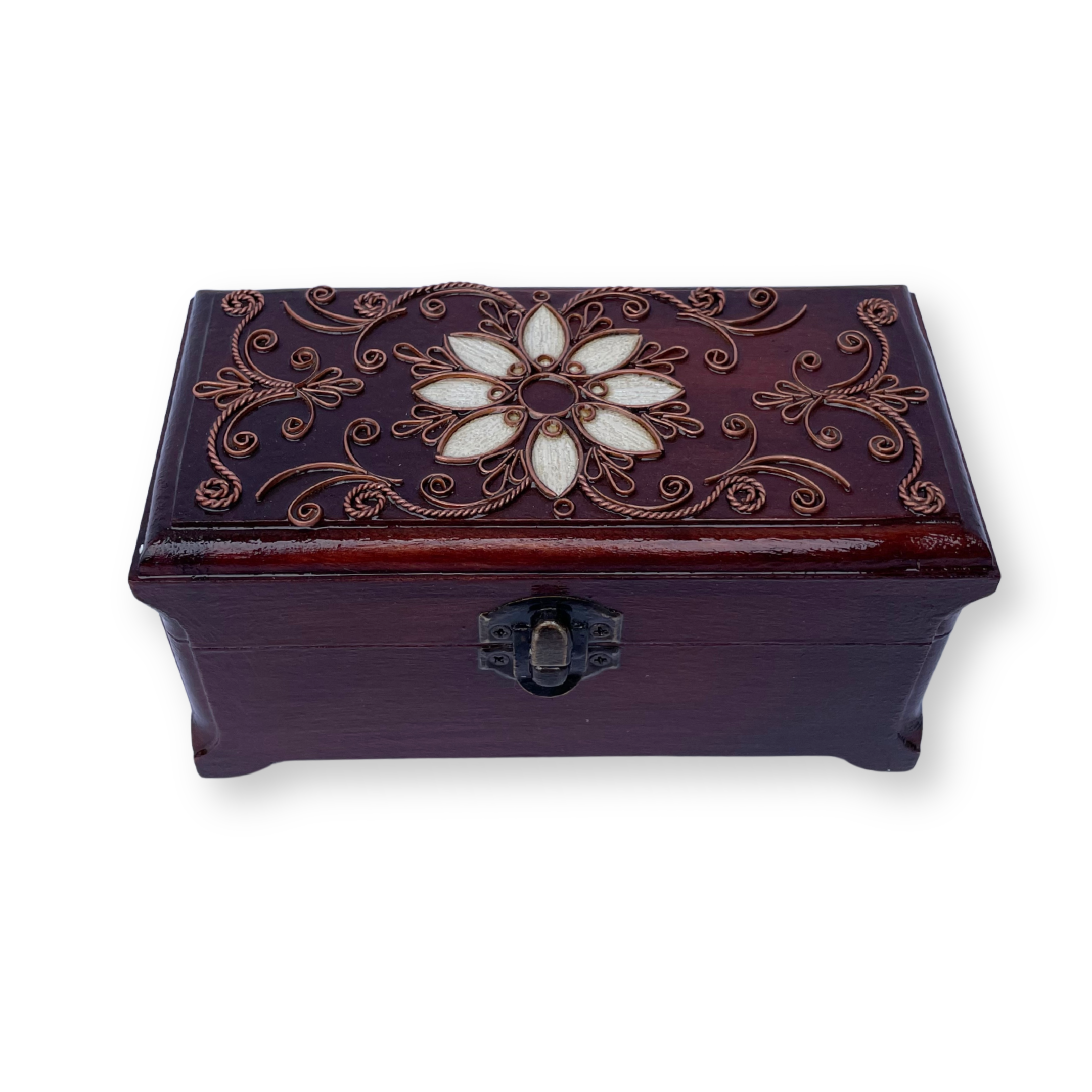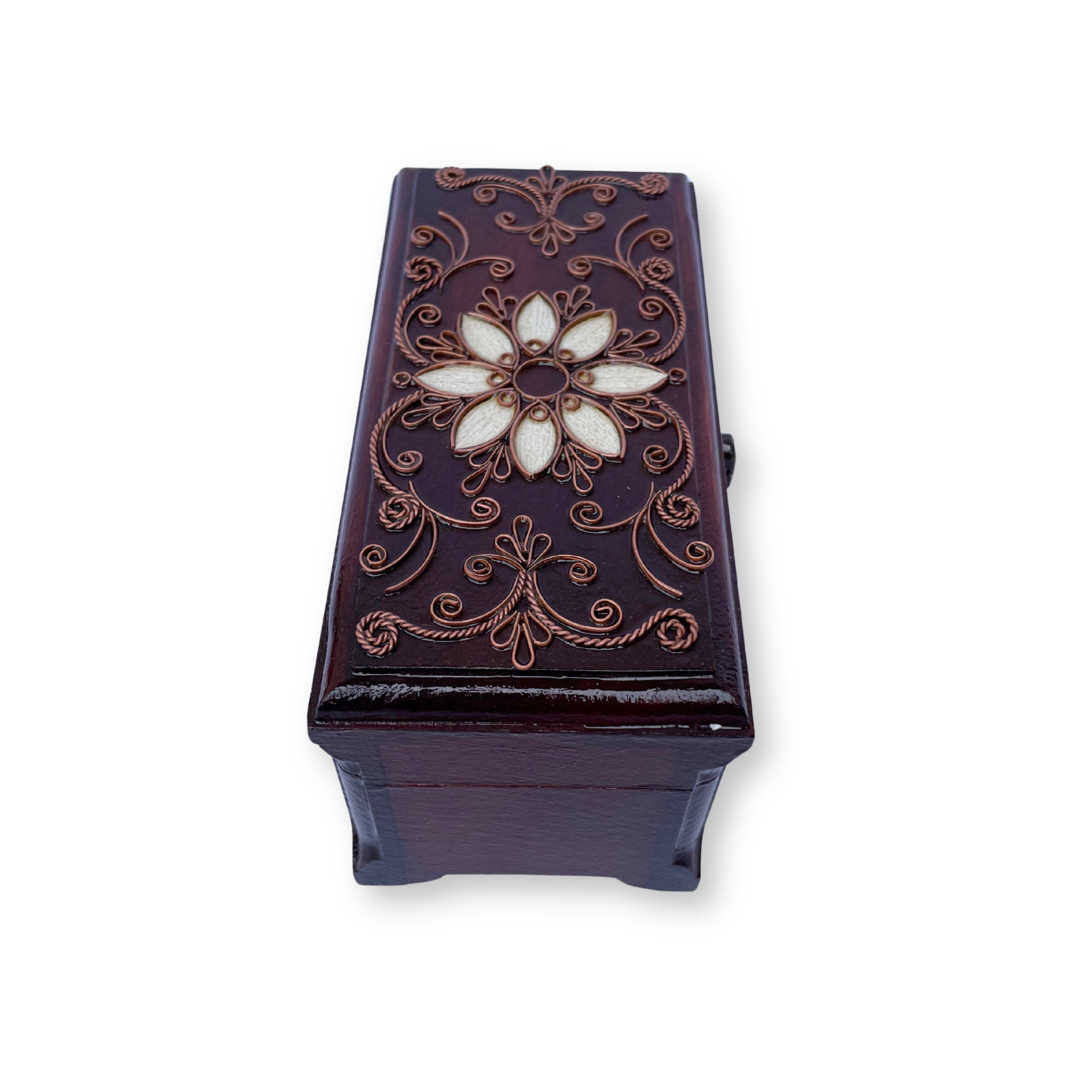 - Ексклюзивна техніка: Кожна шкатулка прикрашена унікальним орнаментом з тонкого мідного дроту в техніці, що імітує старовинну ювелірну філігрань. Це надає виробу об’єму та витонченості.