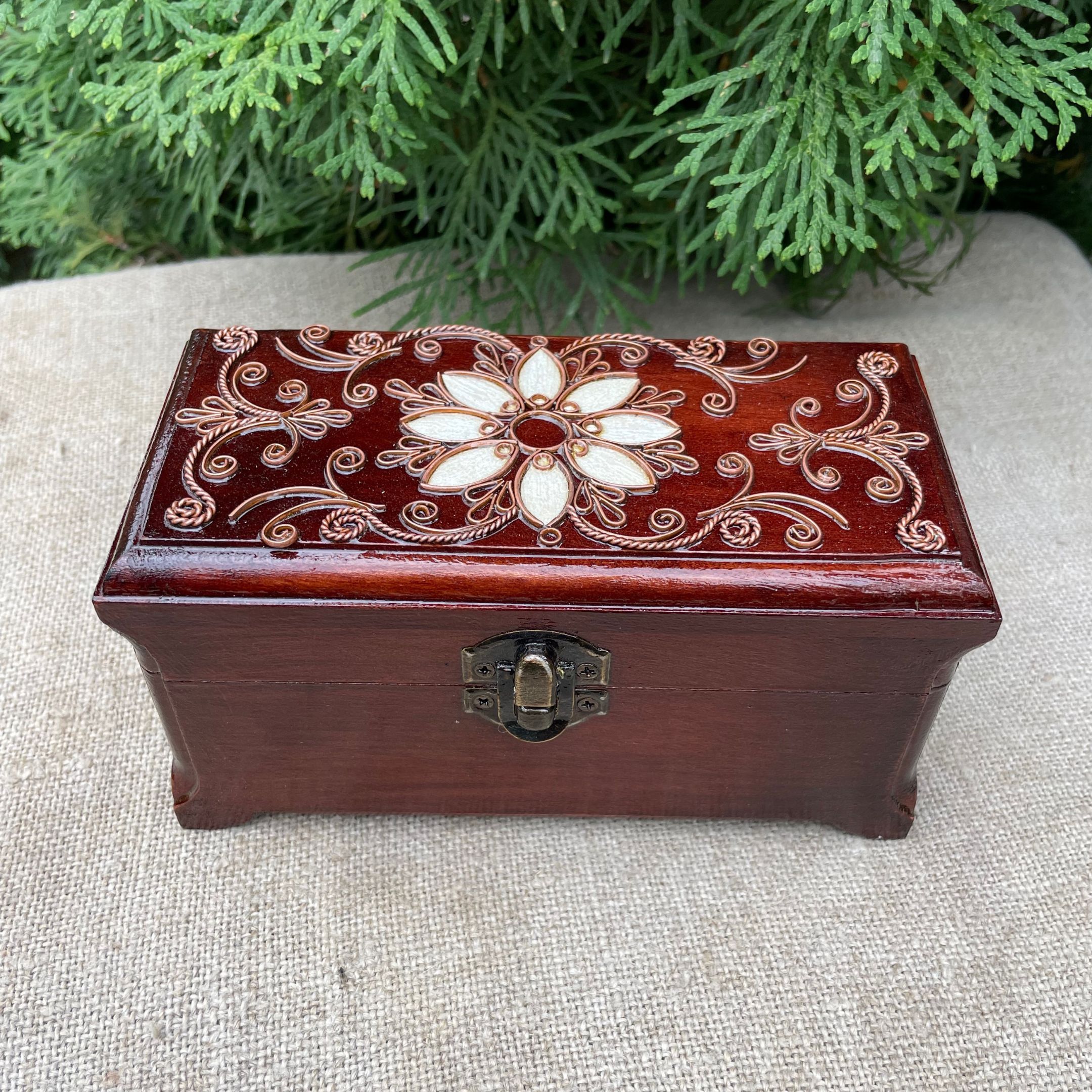 Відкрийте для себе вишукану шкатулку ручної роботи, створену для зберігання найцінніших речей. Ця скринька — не просто місце для коштовностей, а справжній витвір мистецтва, що поєднує тепло натурального дерева та благородний блиск мідного оздоблення.