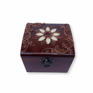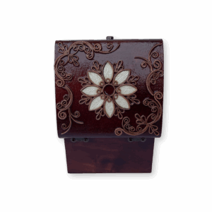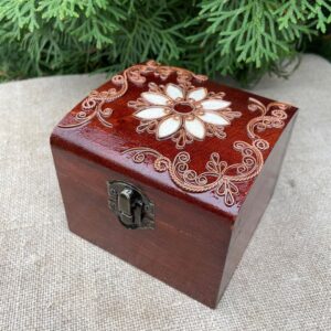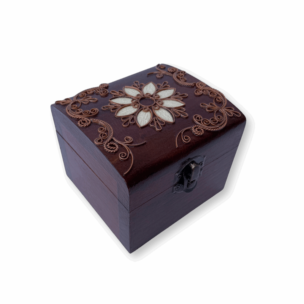 - Ексклюзивна техніка: Кожна шкатулка прикрашена унікальним орнаментом з тонкого мідного дроту в техніці, що імітує старовинну ювелірну філігрань. Це надає виробу об’єму та витонченості.